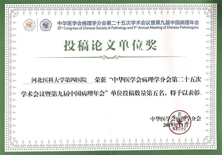 11月14至17日,中华医学会病理学分会第二十五次学术会议暨第九届中国病理年会在河南省郑州市举行。我院病理科及细胞学室投稿共131篇,居全国第五名。大会发言7人次,壁报交流34篇,书面交流91篇,其中3篇壁报被评为“优秀壁报”。我院被大会授予“投稿论文单位奖”,在论文投稿的质和量上得到了国内同行的一致赞誉,为我院在全国病理年会上赢得了荣誉。