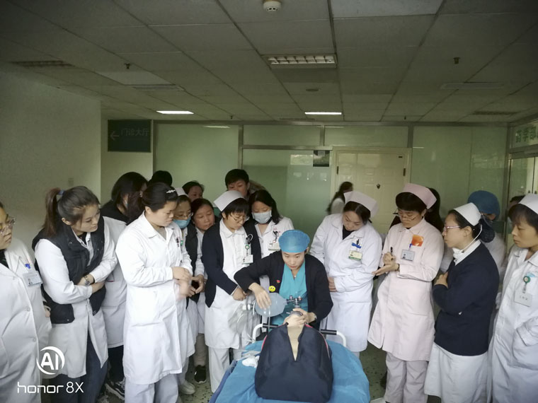 本次培训最大的亮点是打破传统的授课方式,在讲解完毕之后,由急诊科的护士组成四人应急小组,其中三人扮演为相应培训科室人员,一人为急诊科人员,分别编号为A、B、C、D,展示了突发猝死病人的急救模拟演练。模拟演练中,A负责呼救和心肺复苏及抢救中的指挥,B负责管理气道,C负责静脉通路的建立,D为急诊科医护人员,有条不紊地模拟了如遇猝死病人的处理过程。各种急救操作演示完毕后,培训组组织大家分批分组模拟演练,为大家“实战”指导。大家分别进行了单人徒手心肺复苏术的操作及团队配合,各科室的主任和专家也积极投入训练,给青年医务人员作出表率。