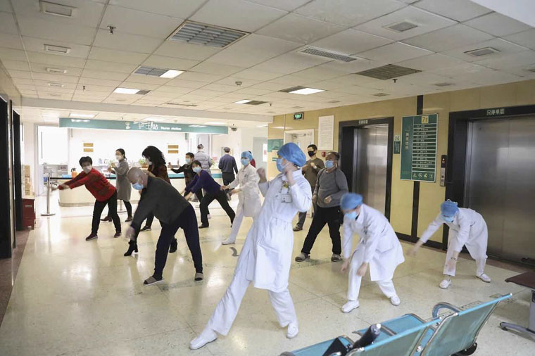 近日,傍晚的放一科病房格外“热闹”。“1,2,3,4……”,患者和家属朋友们列好队形,跟着节拍,集体舞动,气氛愉悦。自3月18日开始,每天晚上7点,由中班护士组织并带领患者及家属在病房中厅跟随视频做医疗保健操,受到大家热烈欢迎。