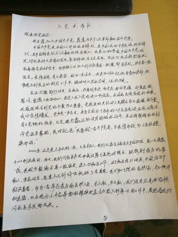 带着对党组织的崇敬和向往,21日,杨大运同志向中共河北援鄂医疗队党总支提交了入党申请书。212日,我院党委同意确定其为入党积极分子。36日,河北省援鄂抗疫第一、二批医疗队医疗救治二支部提出发展杨大运同志为预备党员,317 日,河北省卫健委机关党委审批通过,318日,河北省援鄂抗疫第一、二批医疗队医疗救治二支部接收杨大运同志为预备党员,杨大运同志在武汉一线对党庄严宣誓。