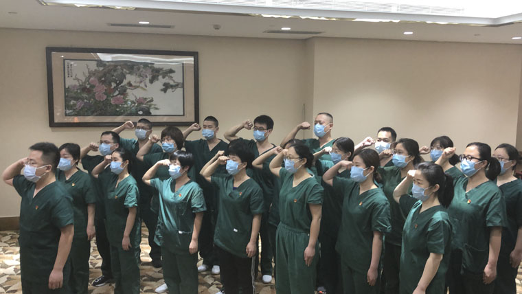 3月18日,申康康带领河北省首批援鄂医疗队前线新入党同志宣誓