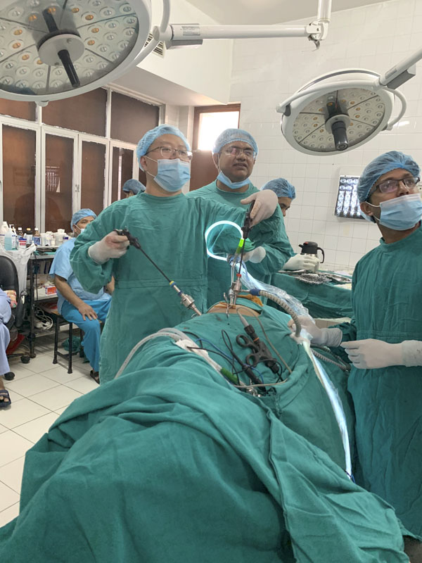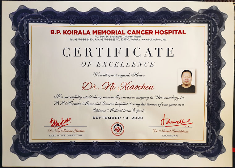 2019年3月,倪晓辰副主任代表我院参加第12批中国援尼泊尔医疗队,抵达万里之遥的尼泊尔B.P柯依拉腊纪念肿瘤医院执行援外任务。受援医院位于尼泊尔中部奇达旺地区,经济落后、交通不便、生活条件差,虽然该院是尼泊尔最大和最有影响力的肿瘤医院,但受限于国情且医疗水平与国内有很大差距。倪晓辰与尼尔曼院长(兼泌尿外科主任)积极深入交流,克服多种困难,竭尽所能地先后开展了腹腔镜肾部分切除术、腹腔镜膀胱根治性切除术、腹腔镜前列腺癌根治术等多种高难度手术术式,填补了该院空白,并对该院医生进行规范化手术培训,培养了一支带不走的医疗队。