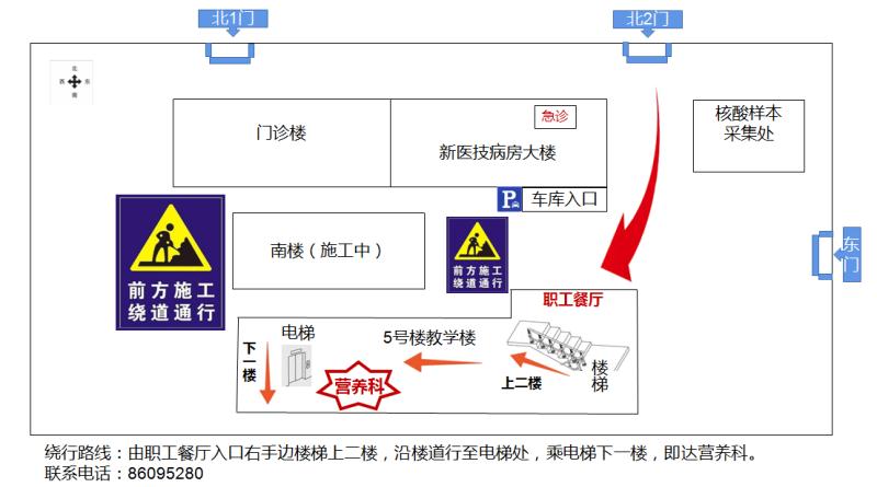 患者及家属朋友们,因我院南楼管道连廊施工,教学楼(5号楼)前的主干道临时封闭,如前往营养科,请根据下面示意图绕行,由此给您带来的不便,敬请谅解!