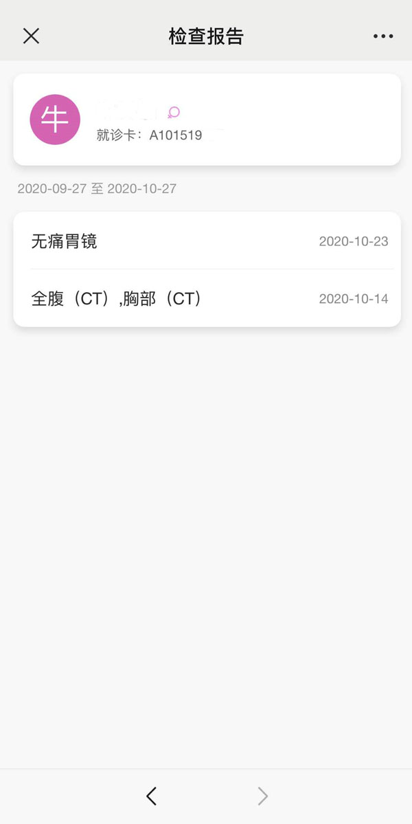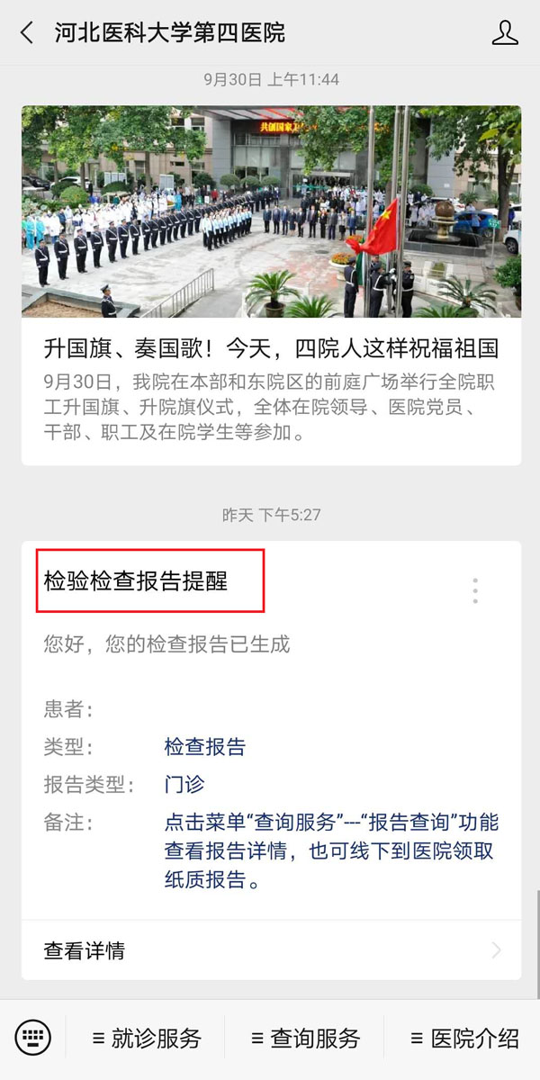 患者通过关注微信公众号,点击“查询服务”----“报告查询”,选择要查询的就诊人,点击需要查看的报告类别,便可看到相应的报告单结果。患者可以减少排队等待取报告的步骤,系统还增加了检查报告提醒功能,患者能更快捷地看到报告单。