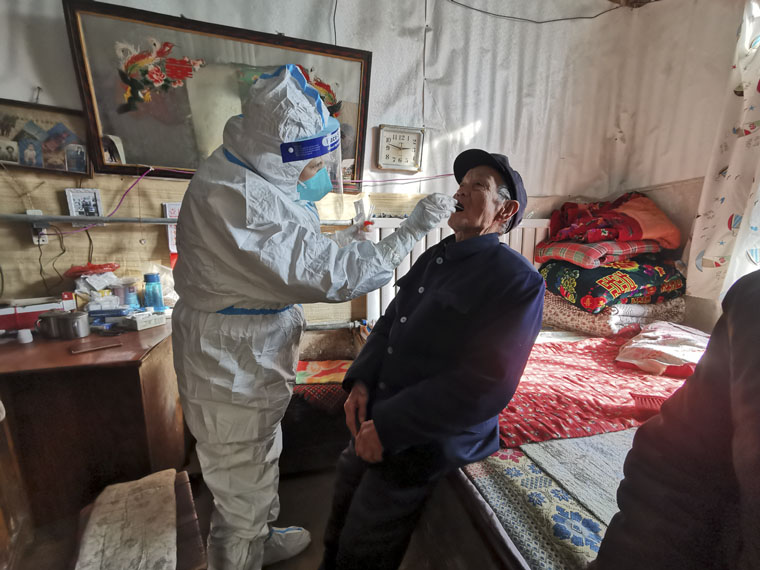 和村里工作人员沟通好后,队员们立即有序组织开展核酸采集工作。有特殊情况的包括瘫痪的、身体不好的和老人小孩儿,队员们会跟随村民挨家挨户的入户采集,保证不落下一人。