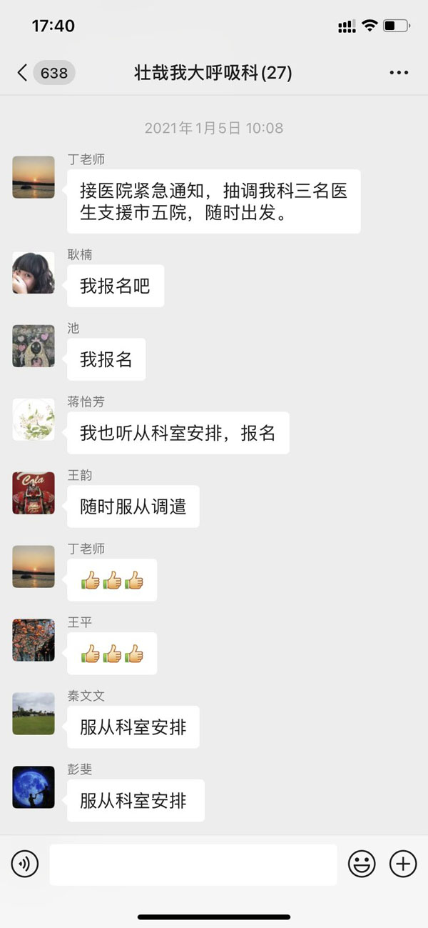 15日上午,呼吸内科接到我院抽调医护人员参与组建抗疫医疗队的任务,短短的几分钟内,科室微信群里请战的信息滚动刷屏。没有华丽的辞藻,没有空洞的口号,一句简单的“我报名”,体现了呼吸内科医护人员面对疫情无所畏惧、勇敢向前的亮剑精神。