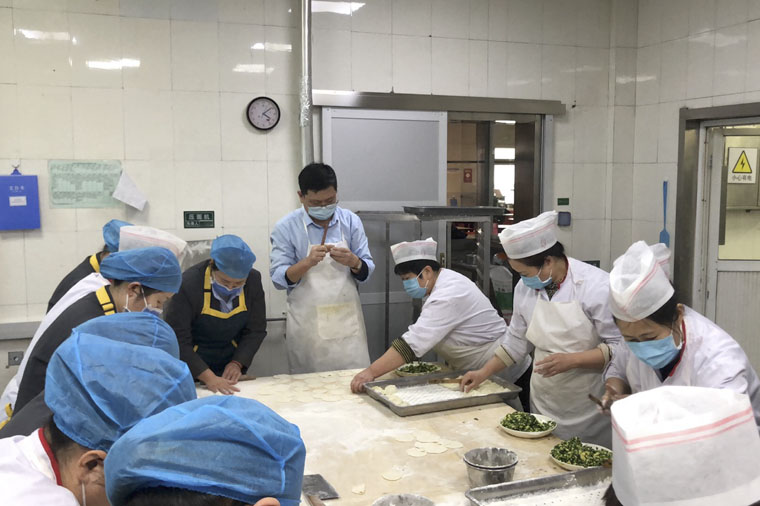 东院膳食部厨师长李福震与大家热火朝天地准备菜肴,他说:这是我除夕夜坚守岗位的第27年,非常有意义,希望石家庄早日彻底战胜疫情!