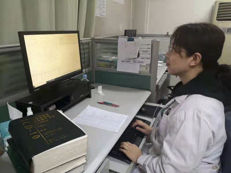 弓丽娜在病案室编码室做相关准备工作。