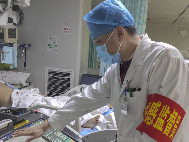 放射科殷风华在东院ICU病区进行床旁检查。