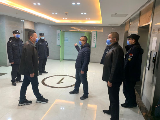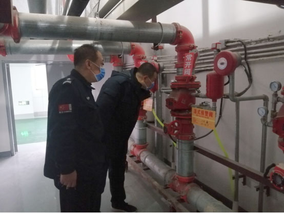 保卫处姚川、彭磊等(上图)带队检查大楼安全情况,张卫斌、马林(下图)对新楼湿式报警阀及喷淋管道进行检查。姚川说:“这是我除夕夜坚守岗位的第19年。19年间,时光飞逝、岁月如流,小‘我’与大‘家’共进,我坚守、我自豪!”