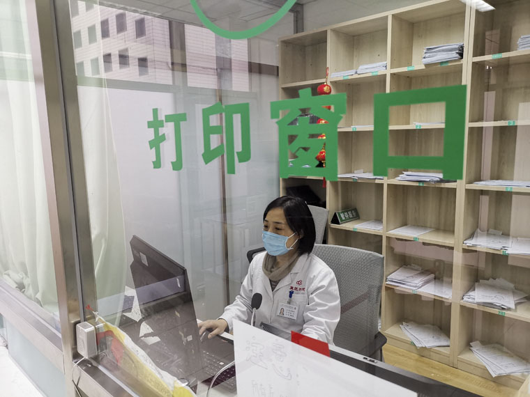 病案室刘冰在窗口打印病历。