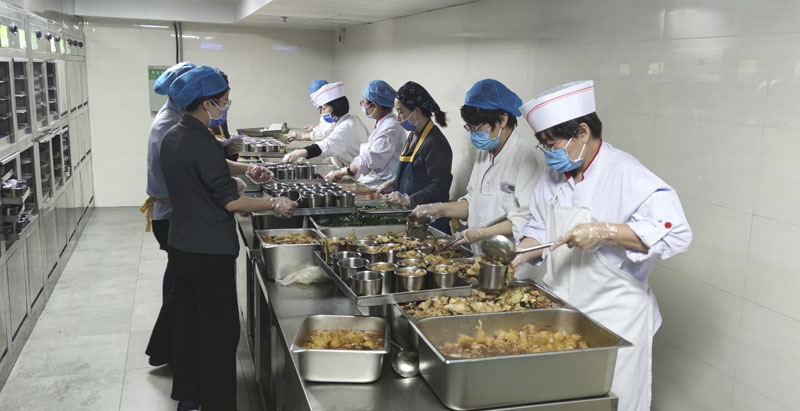 面对全市居民居家隔离,人员、车辆出入严格管控等现状,膳食部成员克服困难,全力投入紧张的工作中。采购员、库管员和供货商密切保持联系,及时补充库存量。随着物资需求的剧增,供货商每天穿梭于市内各大批发市场、超市采进行采购。采购员、库管员随时验收送来的粮食、蔬菜、肉类等物品,检验合格后立即送往食堂或储存。服务员和厨师们整天都在摘菜、洗菜、切配、炒菜、分发,一条生产链上的人员都在忙碌着……馒头等主食需求量非常大,面点师每日早上4点半就开始蒸馒头,中午也不停歇,一直干到晚上8、9点。