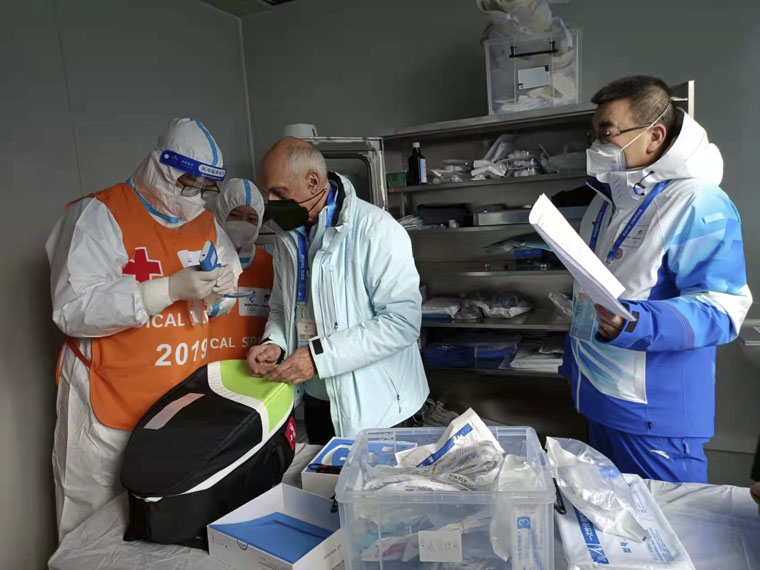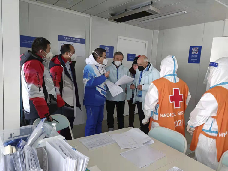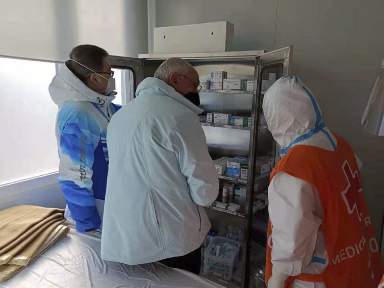 2月8日,国际奥委会医学科学部医疗组主席沃尔夫岗·舍伯斯伯格先生和成员大卫·齐德曼先生实地考察了我院负责保障的国家冬季两项中心运动员医疗站和FOP医疗站,对自动心肺按压系统(LUCAS)、喉镜设备、自动体外除颤器(AED)、危重症抢救药物、外伤急救转运工作进行了专项指导,称赞我院冬奥会医疗保障工作“细节之处见功夫”。