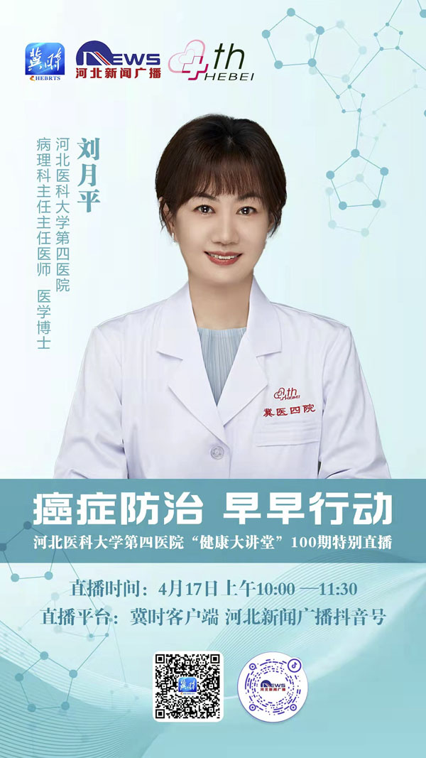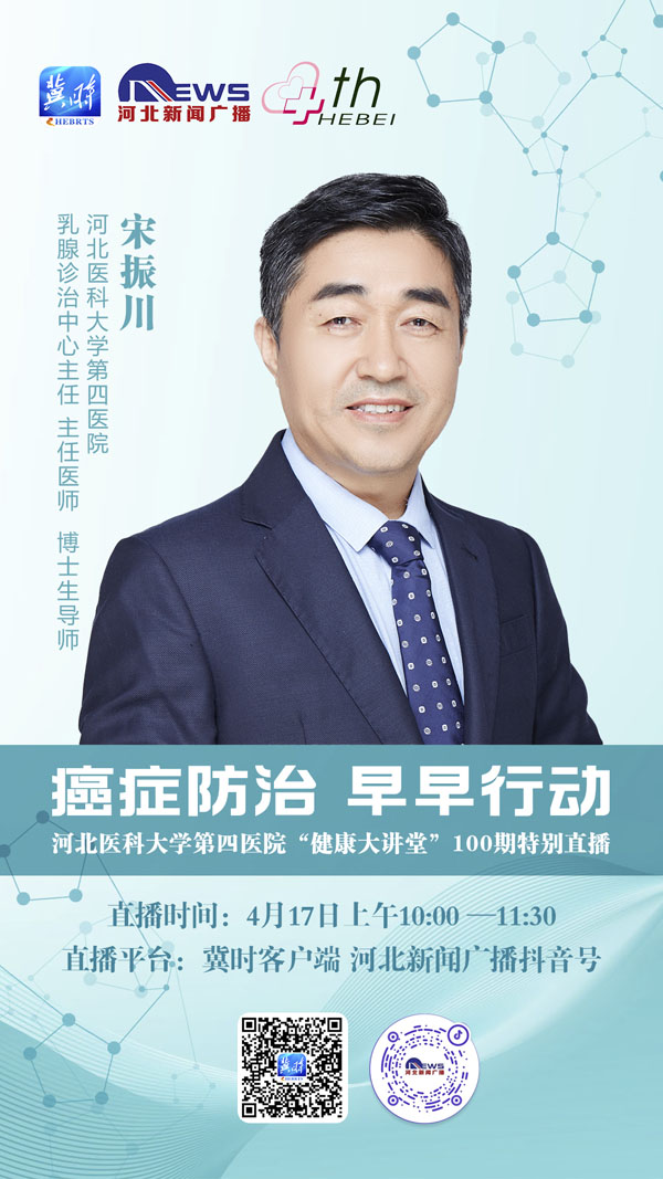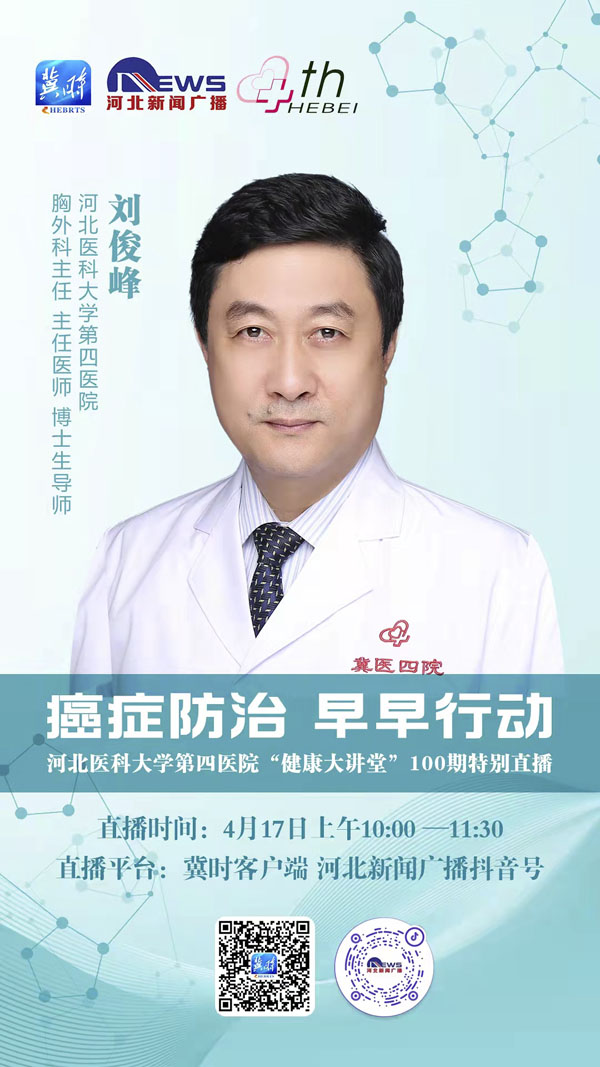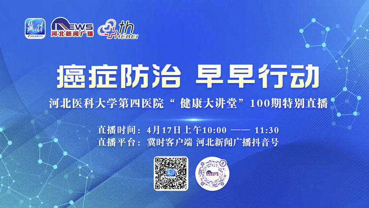 肺癌有哪些早期症状?乳腺癌如何筛查?病理结果怎样才能看得懂呢?在第28个全国肿瘤防治宣传周到来之际,417日,我院与河北广播电视台新闻广播《燕赵大医生》共同推出:癌症防治,早早行动——河北医科大学第四医院“健康大讲堂”第100期特别直播活动,特别邀请了胸外科主任刘俊峰教授、乳腺诊治中心主任宋振川教授、病理科主任刘月平教授。三位权威大咖普及肿瘤防治知识,“云义诊”为大家在线答疑解惑。