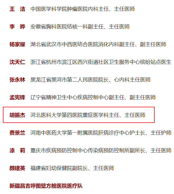 胡振杰,男,汉族,1964年1月生,中共党员,主任医师、教授、博士生导师,现任河北医科大学第四医院重症医学科主任,河北省医学会重症医学分会主任委员,河北省新冠肺炎医疗救治专家组副组长。从医近40载,屡次临危受命,赶赴新冠肺炎疫情以及非典、禽流感、甲型HIN1流感、非洲埃博拉病毒等国内外重大公共事件、突发事件的第一现场,挽救了上万名危重患者的生命。他带领的科室被卫生部首批授予“国家临床重点专科”称号;培养近600名进修医师、护士,100余名研究生,会诊的病人超过20000名,整体抢救成功率近90%。
