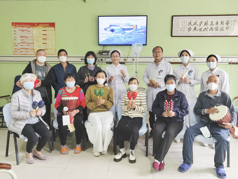 活动以一段优美的音乐干预视频开启,中国抗癌协会肿瘤音乐干预专业委员会副主委,肿瘤内科音乐治疗组组长洪雷副教授介绍了中国抗癌协会对音乐干预这一治疗方式的推荐及规范性流程,并通过“音随我动”的即兴演奏活动让大家近距离感受到音乐干预的魅力与乐趣。王丽曼主管护师带领患者朋友共同进行了“乐在其中”的奥尔夫音乐互动,伴随欢快的节拍、美妙的音乐,患者很快融入音乐的海洋;穆雪静主管护师指引大家进行“弦声入耳”的音乐放松,伴随引导语,患者们通过调整呼吸和肌肉放松来调节个人状态,扫去一天的“疲惫”;朱颖副护士长鼓励广大患者及家属以更加积极、乐观的态度面对肿瘤疾病。活动受到患者一致称赞,在阵阵掌声中落下帷幕。