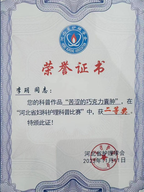 11月9日—11日,河北省护理学会妇科专业委员会在石家庄市召开“河北省妇科护理新进展研讨会暨盆底康复技术研讨会”。会议前期面向全省征集优秀科普作品,共78个作品入围复赛,经过激烈的角逐,我院妇一科王艳伟、苏岩岩的作品《淋巴水肿手法引流》和李玥的作品《女性“生育之敌”巧克力囊肿》脱颖而出,分别在决赛中获得一等奖和二等奖的优异成绩。