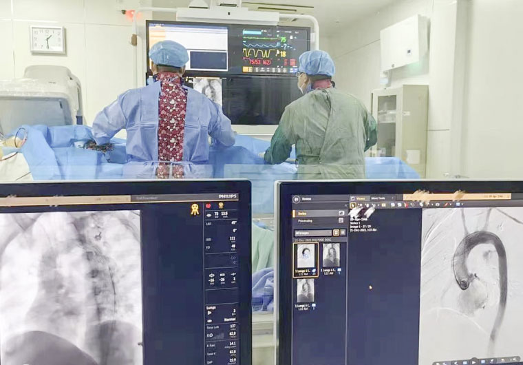 “病情十分紧急,如不及时治疗,后果不堪设想……”此时,麻醉一科、介入手术室立即行动,迅速进行术前准备。术中,在心外科赵永波主任的指导下,李超主治医师为患者实施胸主动脉覆膜支架腔内隔绝术。手术异常艰辛,心外科团队全神贯注,将支架顺利释放,患者生命体征保持平稳,手术顺利完成。家属对心外科赵永波主任、李超主治医师以及樊克非主管药师表示敬意,“省四院的大夫医术高超,很有热心肠,太感谢你们了”。患者术后恢复顺利,已平安出院。