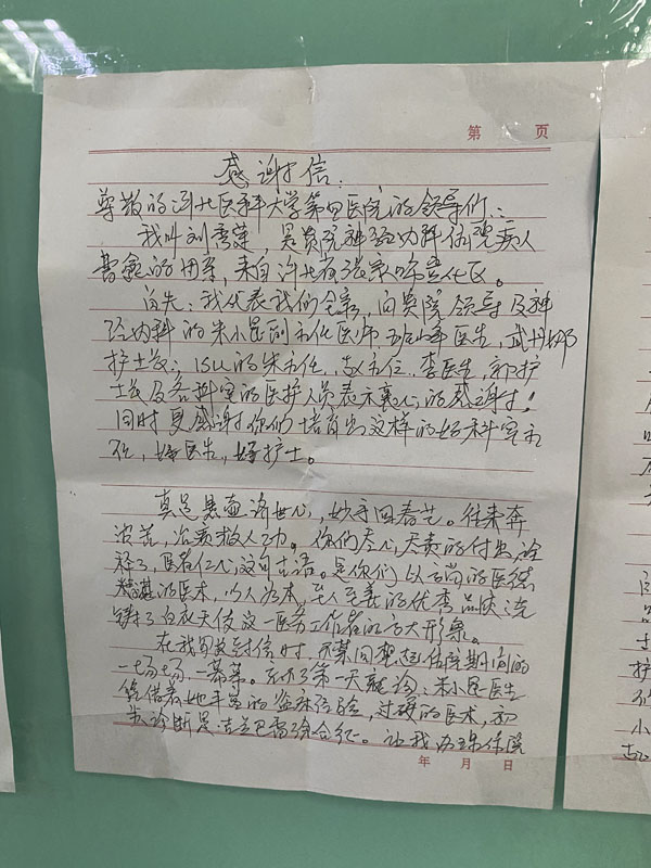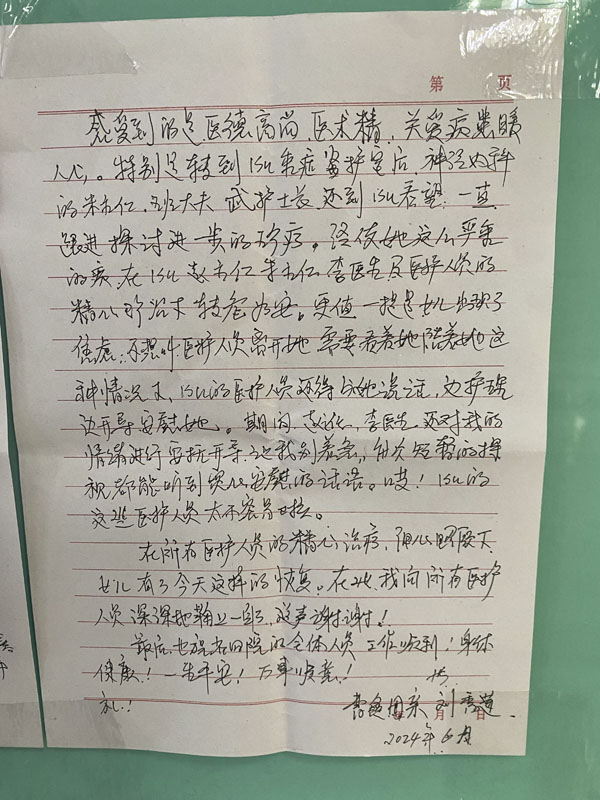 经历了“绝处逢生”,患者和家属对我院的诊治水平和服务水平表示充分肯定,在感谢信中,她真情回忆着在院的点点滴滴,字字流露出对我院神经内科、重症医学科、CT磁共振科、疼痛康复科医护人员的感恩与祝福。