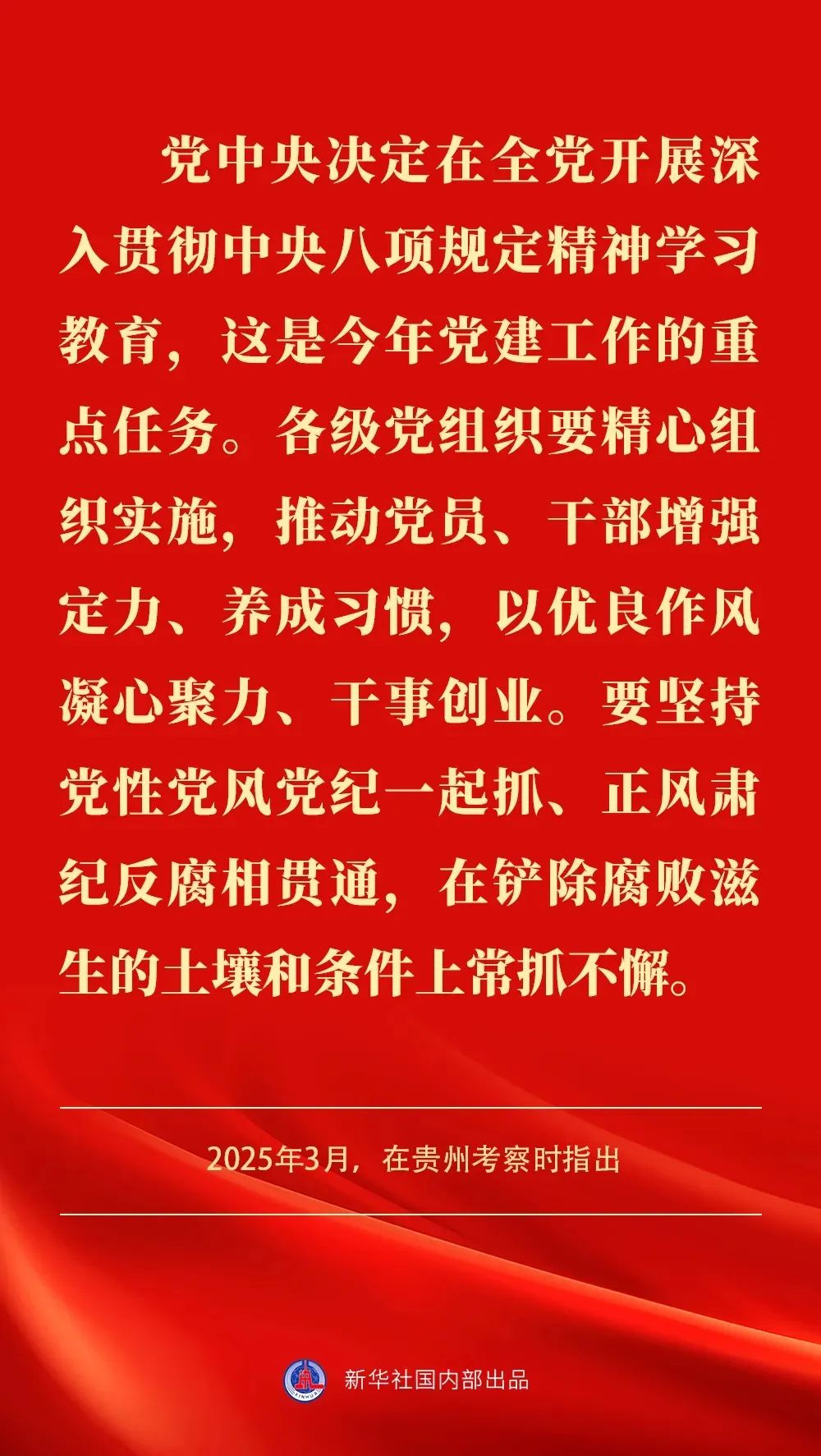 中央党的建设工作领导小组近日召开会议指出,党中央决定,自2025年全国两会后至7月在全党开展深入贯彻中央八项规定精神学习教育。