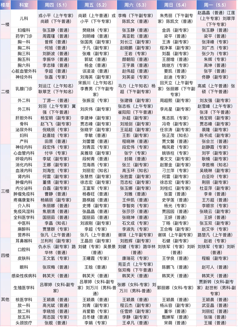 “五一”出诊安排