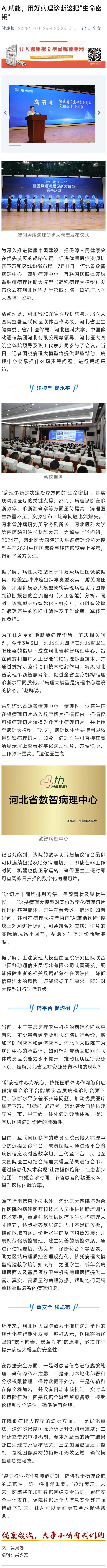 权威关注!河北日报+健康报深度追踪我院肿瘤病理诊断大模型:为肿瘤诊疗装上“慧眼”