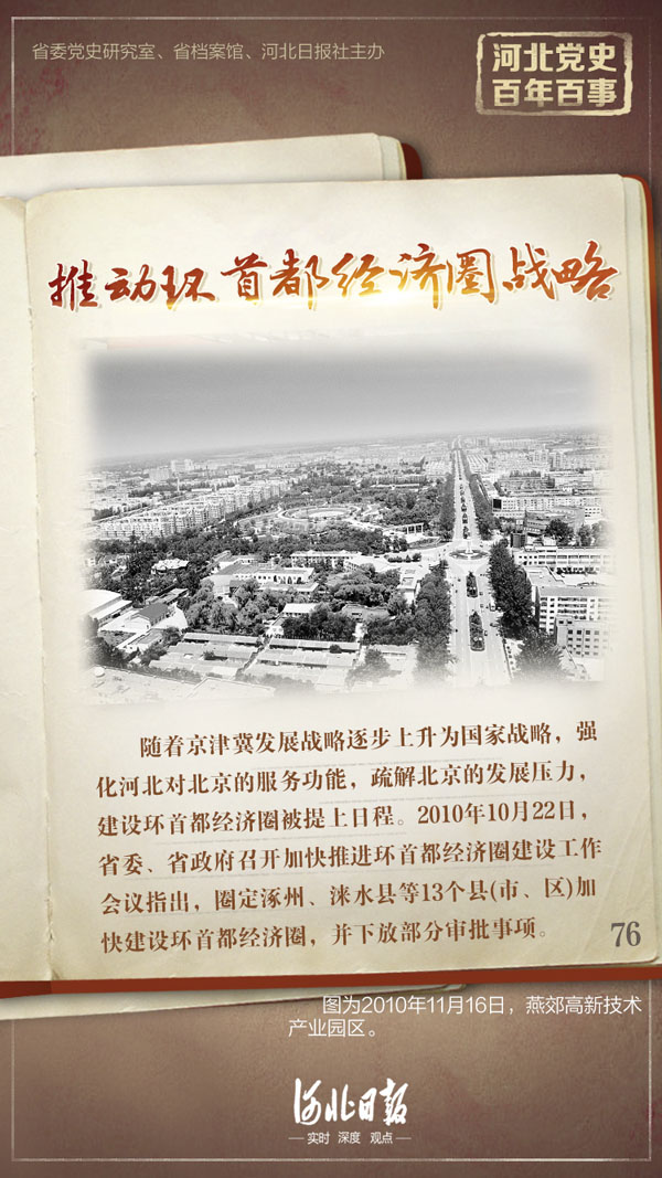 随着京津冀发展战略逐步上升为国家战略,强化河北对北京的服务功能,疏解北京的发展压力,建设环首都经济圈被提上日程。在河北省编制的第十二个五年规划中,提出六大工作重点之一就是推进环首都经济圈的建设。2010年10月22日,河北省委、省政府召开加快推进环首都经济圈建设工作会议指出,圈定涿州市、涞水县等13个县(市、区)加快建设环首都经济圈,并下放部分审批事项。建设环首都经济圈的总体战略构想是“13县1圈4区6基地”。13县即环绕北京的涿州市、涞水县、涿鹿县、怀来县、赤城县、丰宁满族自治县、滦平县、三河市、大厂回族自治县、香河县、广阳区、安次区、固安县;1圈即以新兴产业为主导的环首都经济圈,2.7万平方公里485万人口;4区即环首都经济圈高层次人才创业园区、科技成果孵化园区、新兴产业示范园区、现代物流园区;6基地即在环首都经济圈内建设养老、健身、休闲度假、观光旅游、有机蔬菜、宜居生活基地。打造环首都经济圈的起点是打造三个新城:一是以廊坊市“北三县”为基础,建设京东新城;二是以涿州为基础,建设京南新城;三是以怀来、涿鹿为基础,建设京北新城。