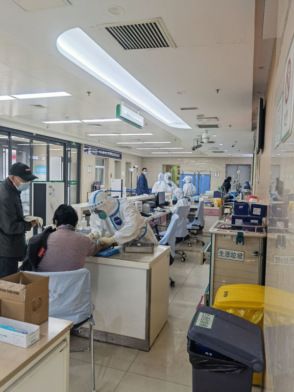 当面对患者激增、人员不足、感染风险增大等难题时,东院区急诊科同样开启了“吃住在科里,只有上班没有下班的24小时工作模式”。全员加班加点,党员发挥先锋模范作用,不断改造布局、优化工作流程、完善院感管理。为了降低院内感染风险,紧急改造抢救、急诊门诊隔离缓冲间,严格实行“一患一消”“一患一陪”制度,查验核酸结果,坚持救治与防控两手抓。