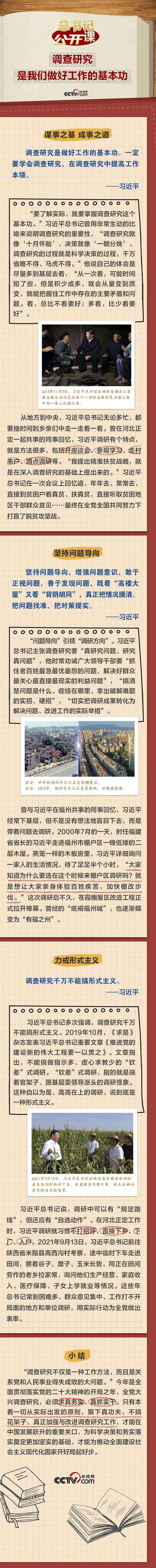 “调查研究是谋事之基、成事之道,没有调查就没有发言权,没有调查就没有决策权。调查研究是我们做好工作的基本功。”习近平总书记非常重视调查研究,并一以贯之身体力行、率先垂范,推动全党大兴调查研究之风。本期《总书记“公开课”》聚焦总书记关于调查研究的所思所言所行,让我们一起学习领会。